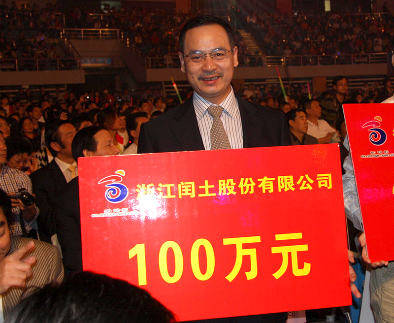 10月11日,阮加春總經(jīng)理在第八屆全國(guó)殘運(yùn)會(huì)倒計(jì)時(shí)一周年大型愛(ài)心助殘晚會(huì)上接受中國(guó)殘聯(lián)主席張海迪(坐輪椅者)頒發(fā)“愛(ài)心企業(yè)”獎(jiǎng)牌。浙江省省長(zhǎng)呂祖善等領(lǐng)導(dǎo)出席了本次活動(dòng)。